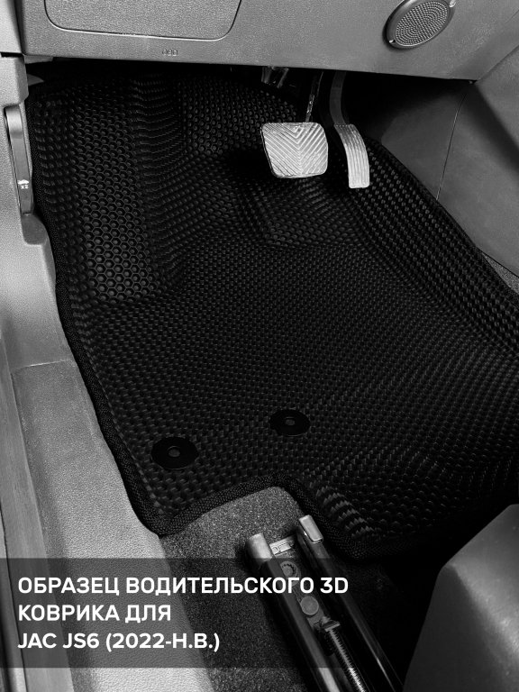 Автомобильные 3д коврики для JAC JS6 (2022-н.в) в салон авто и багажник сделаны из инновационного полимерного материала EVA, изысканная структура в виде ячеек не дает воде, пыли и снегу разлетаться по салону машины и багажнику. 3д коврики зафиксированы на полу определенными клипсами, соответствующими JAC JS6 (2022-н.в), и не двигаются в процессе езды.